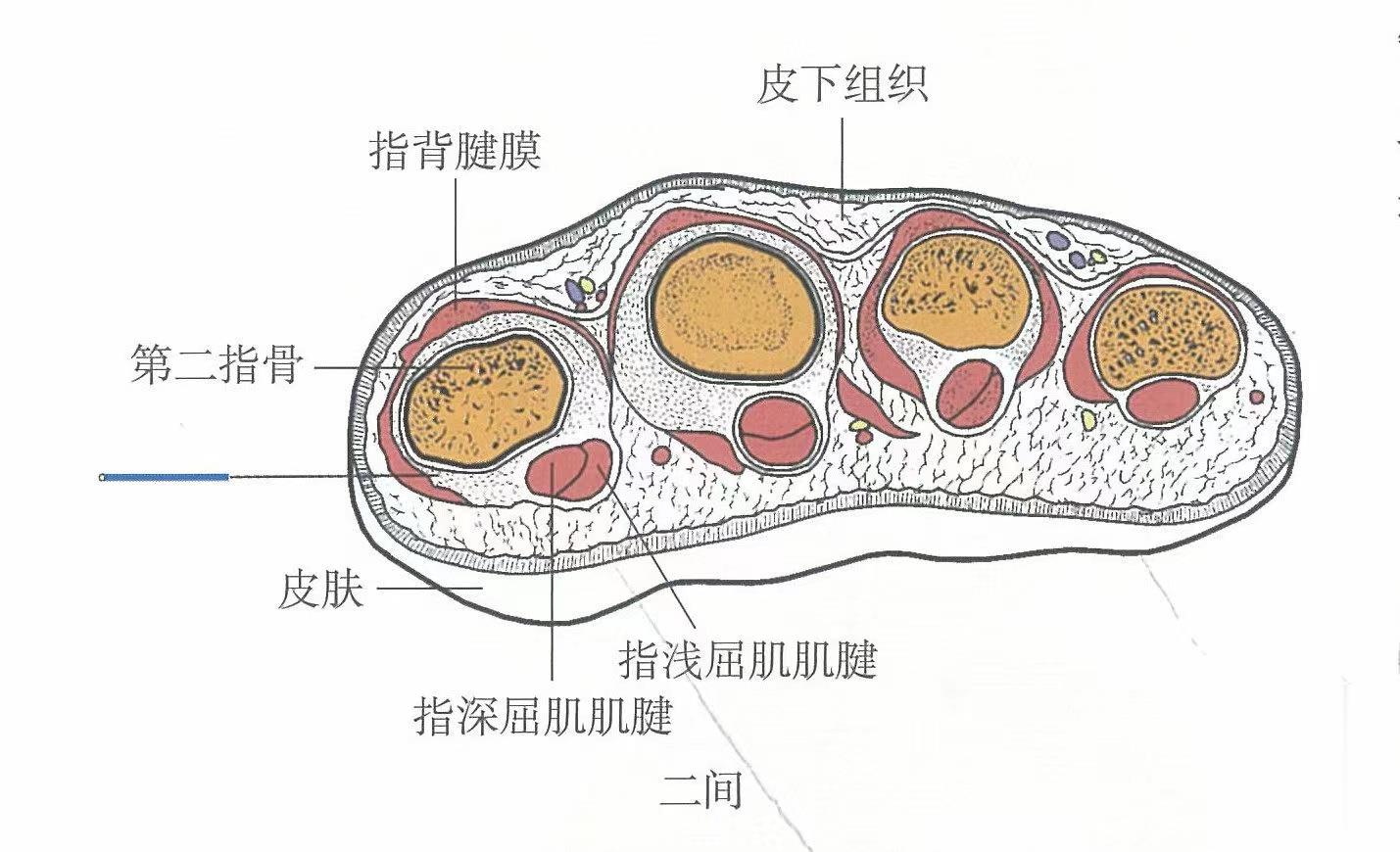 【解剖】有指淺、深屈肌腱;有來自橈動脈的指背及掌側(cè)動、靜脈;布有橈神經(jīng)的指背側(cè)固有神經(jīng),正中神經(jīng)的指掌側(cè)固有神經(jīng)。