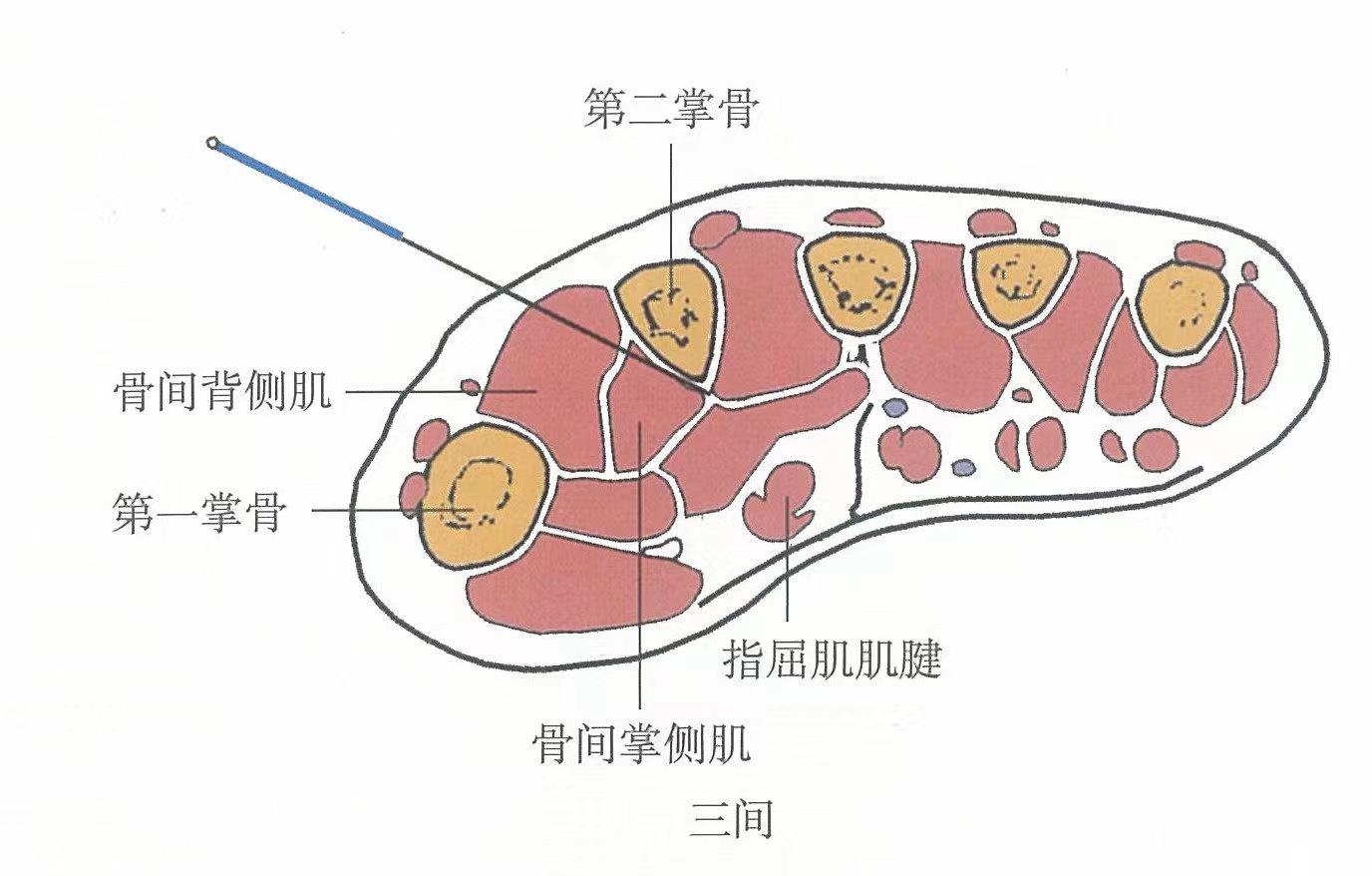 【解剖】有第1骨間背側(cè)肌,深層為拇內(nèi)收肌橫頭;有手背靜脈網(wǎng)(頭靜脈起始部)、指掌側(cè)固有動(dòng)脈;布有橈神經(jīng)淺支。