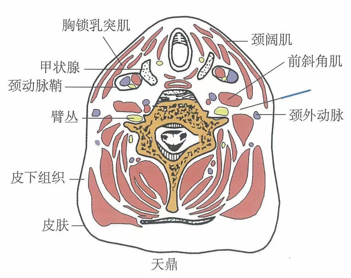 【解剖】皮膚→皮下組織→胸鎖乳突肌后緣→斜角肌間隙。淺層內(nèi)有頸橫神經(jīng)、頸外靜脈和頸闊肌。深層布有頸升動、靜脈分支或?qū)僦?,在斜角肌間隙內(nèi)分布著臂叢神經(jīng)等結(jié)構(gòu)。