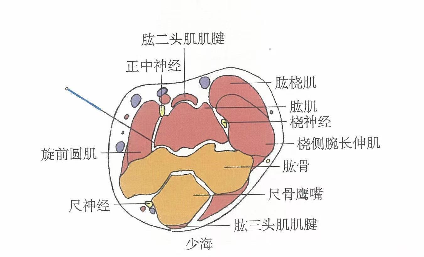 【解剖】皮膚→皮下組織→旋前圓肌→肱肌。淺層布有前臂內(nèi)側(cè)皮神經(jīng),貴要靜脈。深層有正中神經(jīng),尺側(cè)返動(dòng)、靜脈和尺側(cè)下副動(dòng)、靜脈的吻合支。