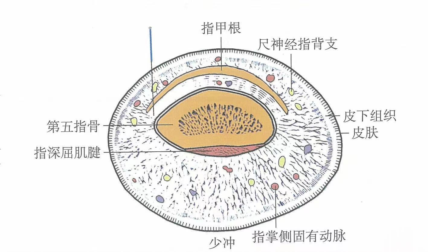 【解剖】皮膚→皮下組織→指甲根。布有尺神經(jīng)的指掌側(cè)固有神經(jīng)指背支和指掌側(cè)固有動(dòng)、靜脈指背支形成的動(dòng)、靜脈網(wǎng)。