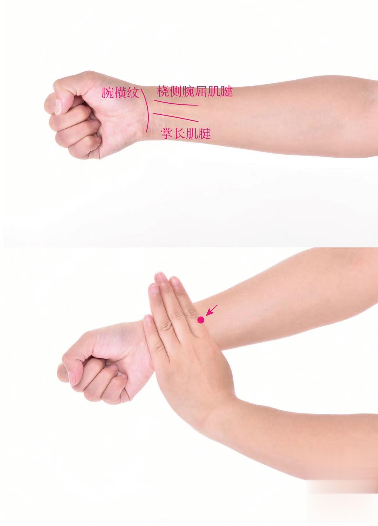 坐位。伸臂仰掌,微屈腕握拳,從腕橫紋向上4橫指,在掌長肌腱和橈側(cè)腕屈肌腱(手臂內(nèi)側(cè)可觸摸到兩條索狀筋,握拳用力屈腕時明顯可見)之間的凹陷中,按壓有酸脹感處即為此穴。