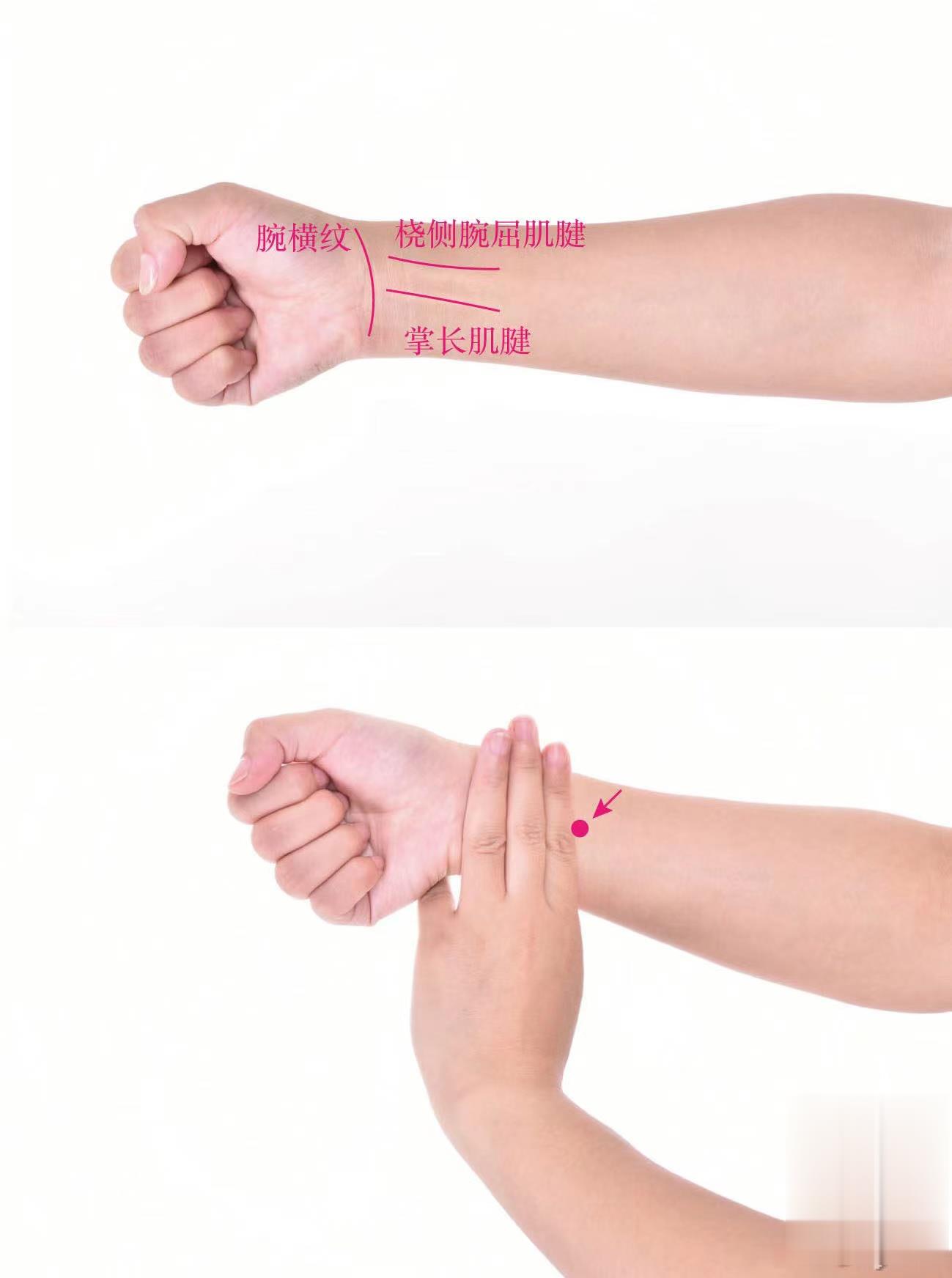 【位置】在前臂前區(qū),腕掌側(cè)遠(yuǎn)端橫紋上2寸,掌長(zhǎng)肌腱與橈側(cè)腕屈肌腱之間。