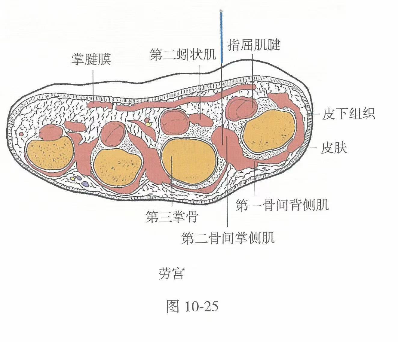 【解剖】皮膚→皮下組織→掌腱膜→橈側兩根指淺、深屈肌腱之間→第2蚓狀肌橈側→第1骨間掌側肌和第2骨間背側肌。淺層分布有正中神經的掌支和手掌側靜脈網。深層有指掌側總動脈,正中神經的指掌側固有神經。