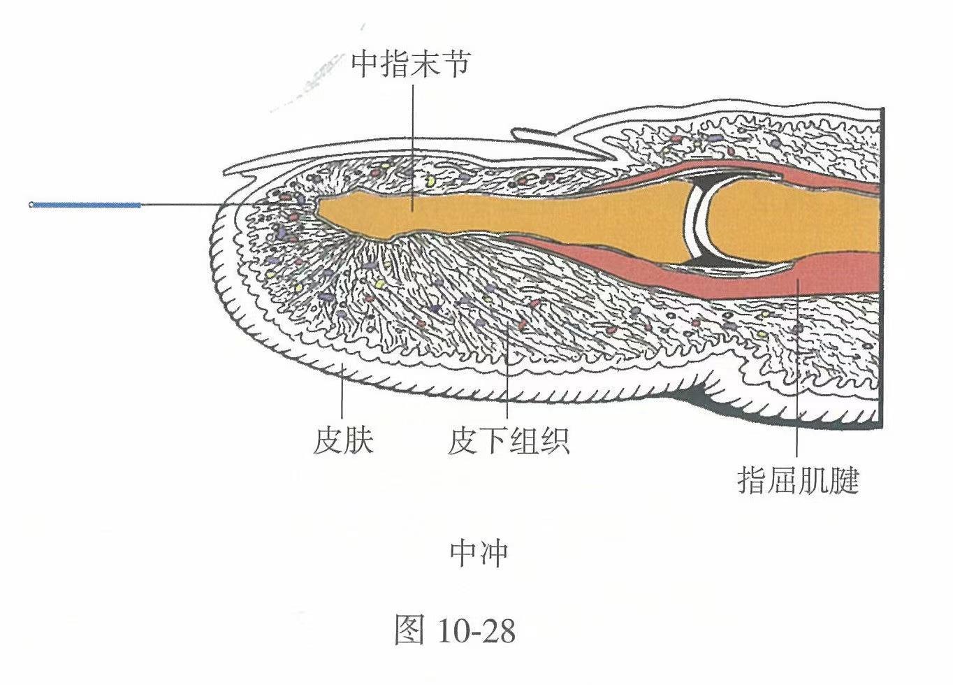 【解剖】皮膚→皮下組織。分布有正中神經(jīng)的指掌側(cè)固有神經(jīng)末梢,指掌側(cè)動(dòng)、靜脈的動(dòng)、靜脈網(wǎng)。皮下組織內(nèi)富含纖維束,纖維束外連皮膚,內(nèi)連遠(yuǎn)節(jié)指骨骨膜。