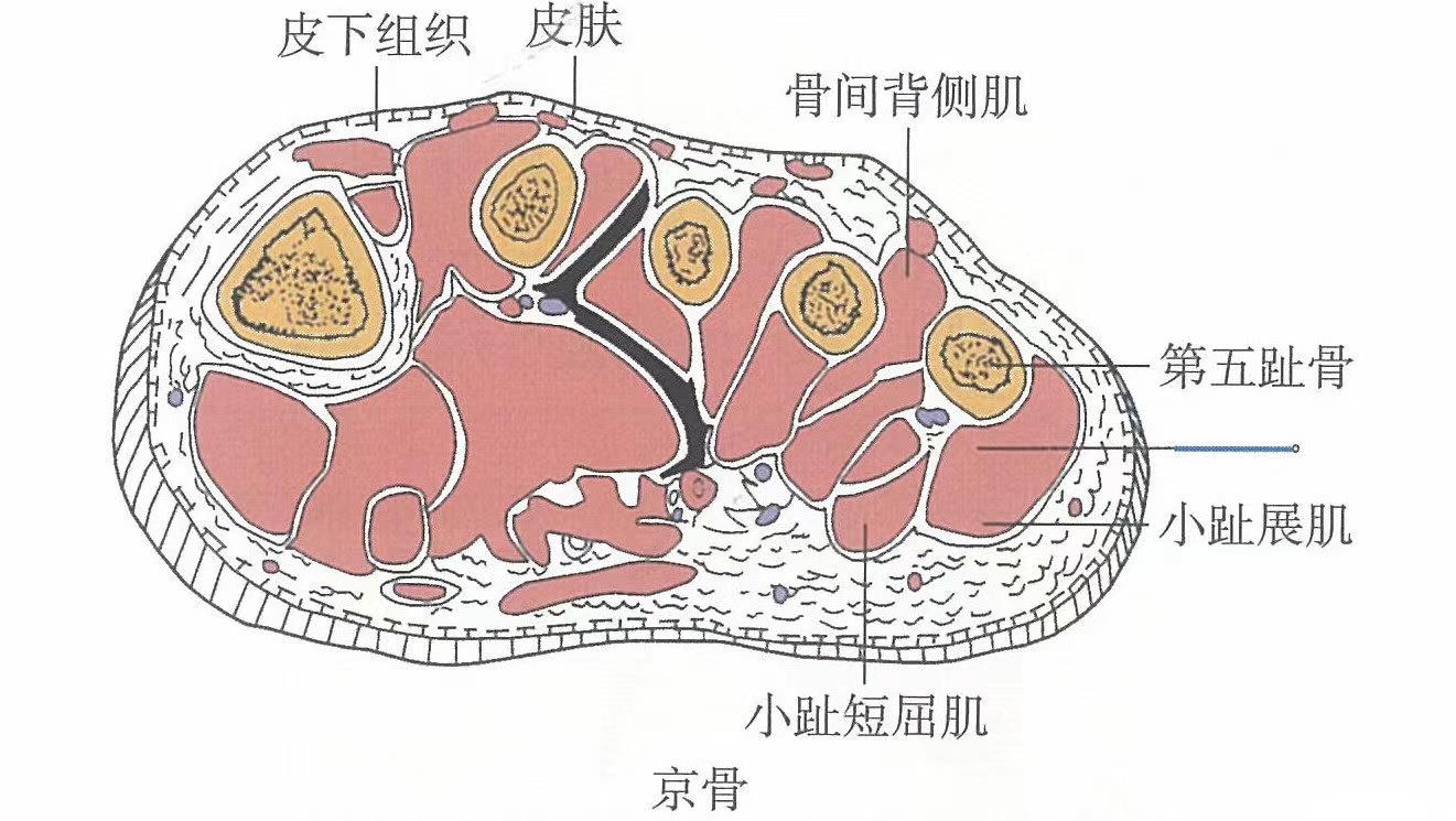 【解剖】皮膚→皮下組織→小趾展肌。布有足背外側(cè)皮神經(jīng),足外側(cè)緣靜脈。