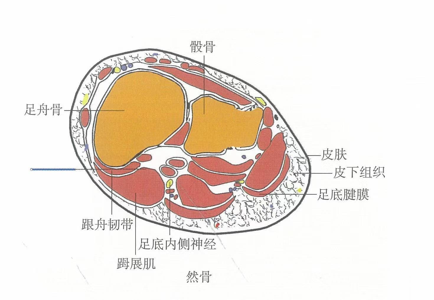 【解剖】皮膚→皮下組織→展肌→趾長屈肌腱。淺層布有隱神經(jīng)的小腿內(nèi)側(cè)皮支、足底內(nèi)側(cè)神經(jīng)皮支和足背靜脈網(wǎng)的屬支。深層有足底內(nèi)側(cè)神經(jīng)和足底內(nèi)側(cè)動、靜脈。