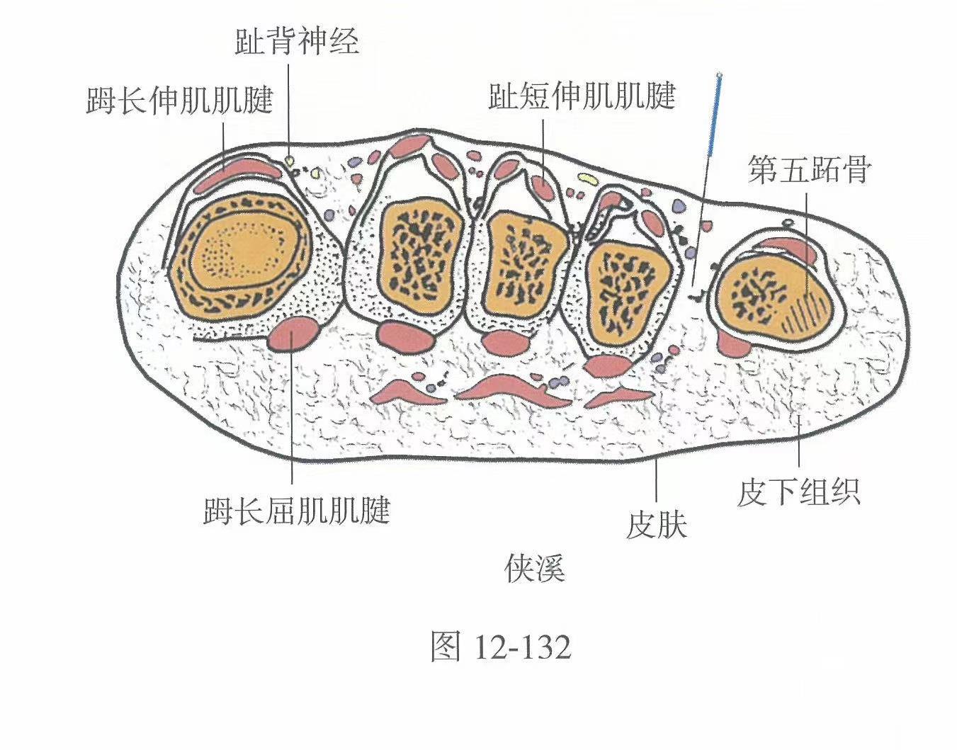 俠溪配行間、內(nèi)庭穴,治足跗腫痛。