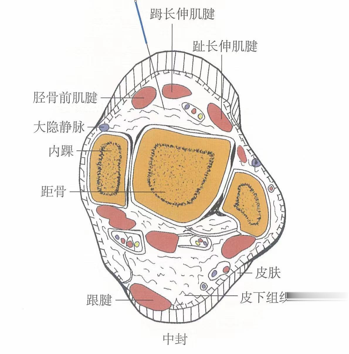 【解剖】在長(zhǎng)伸肌腱外緣;有足背靜脈網(wǎng)、第1跖背動(dòng)脈;布有腓深神經(jīng)的跖背側(cè)神經(jīng),深層為脛神經(jīng)的足底內(nèi)側(cè)神經(jīng)。