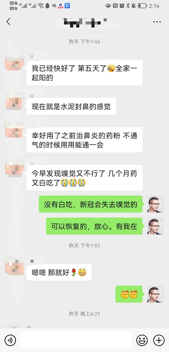 新冠,全家一起陽(yáng)的。 第五天了,現(xiàn)在就是水泥封鼻的感覺(jué),今早發(fā)現(xiàn)嗅覺(jué)又不行了 。張醫(yī)生來(lái)解決這個(gè)問(wèn)題。