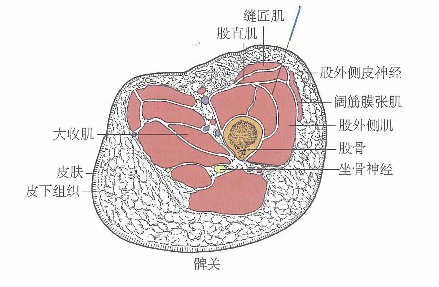 【解剖】皮膚→皮下組織→闊筋膜張肌與縫匠肌之間→股直肌→股外側(cè)肌。淺層布有股外側(cè)皮神經(jīng)。深層有旋股外側(cè)動(dòng)、靜脈的升支,股神經(jīng)的肌支。