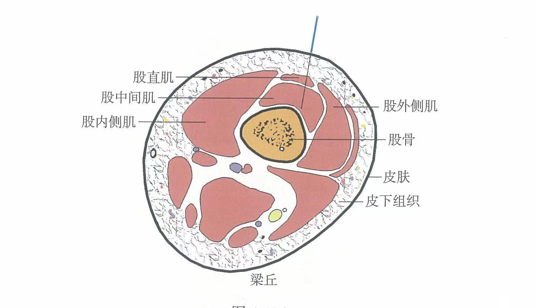 【解剖】皮膚→皮下組織→股直肌腱與股外側(cè)肌之間→股中間肌腱的外側(cè)。淺層布有股神經(jīng)的前皮支和股外側(cè)皮神經(jīng)。深層有旋股外側(cè)動、靜脈的降支和股神經(jīng)的肌支。