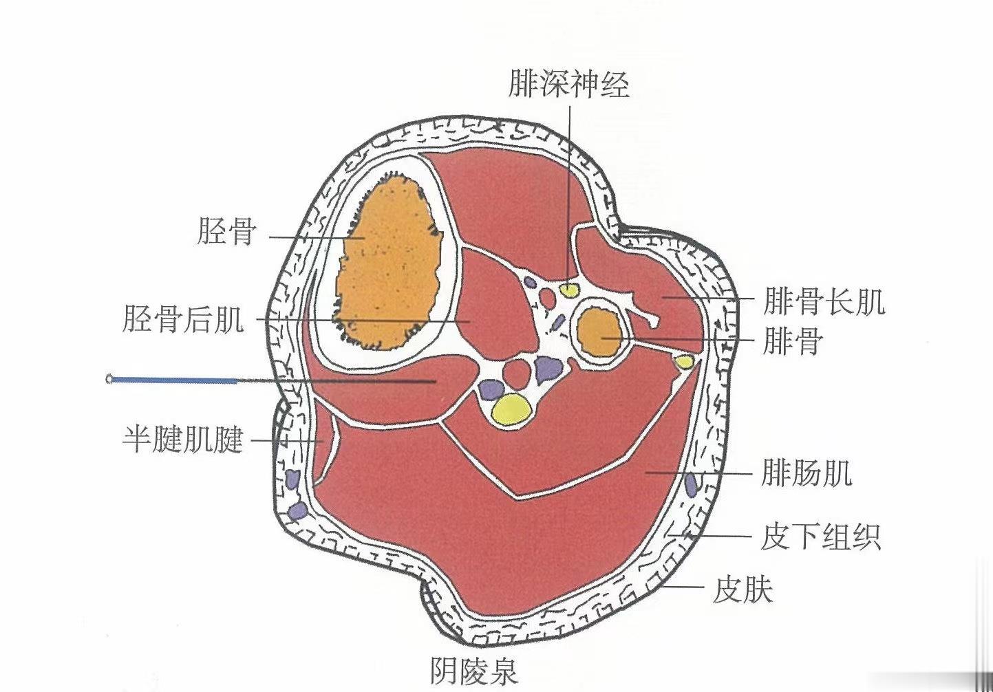 【解剖】皮膚→皮下組織→半腱肌腱→腓腸肌內(nèi)側(cè)頭。淺層布有隱神經(jīng)的小腿內(nèi)側(cè)皮支,大隱靜脈和膝降動(dòng)脈分支。深層有膝下內(nèi)側(cè)動(dòng)、靜脈。