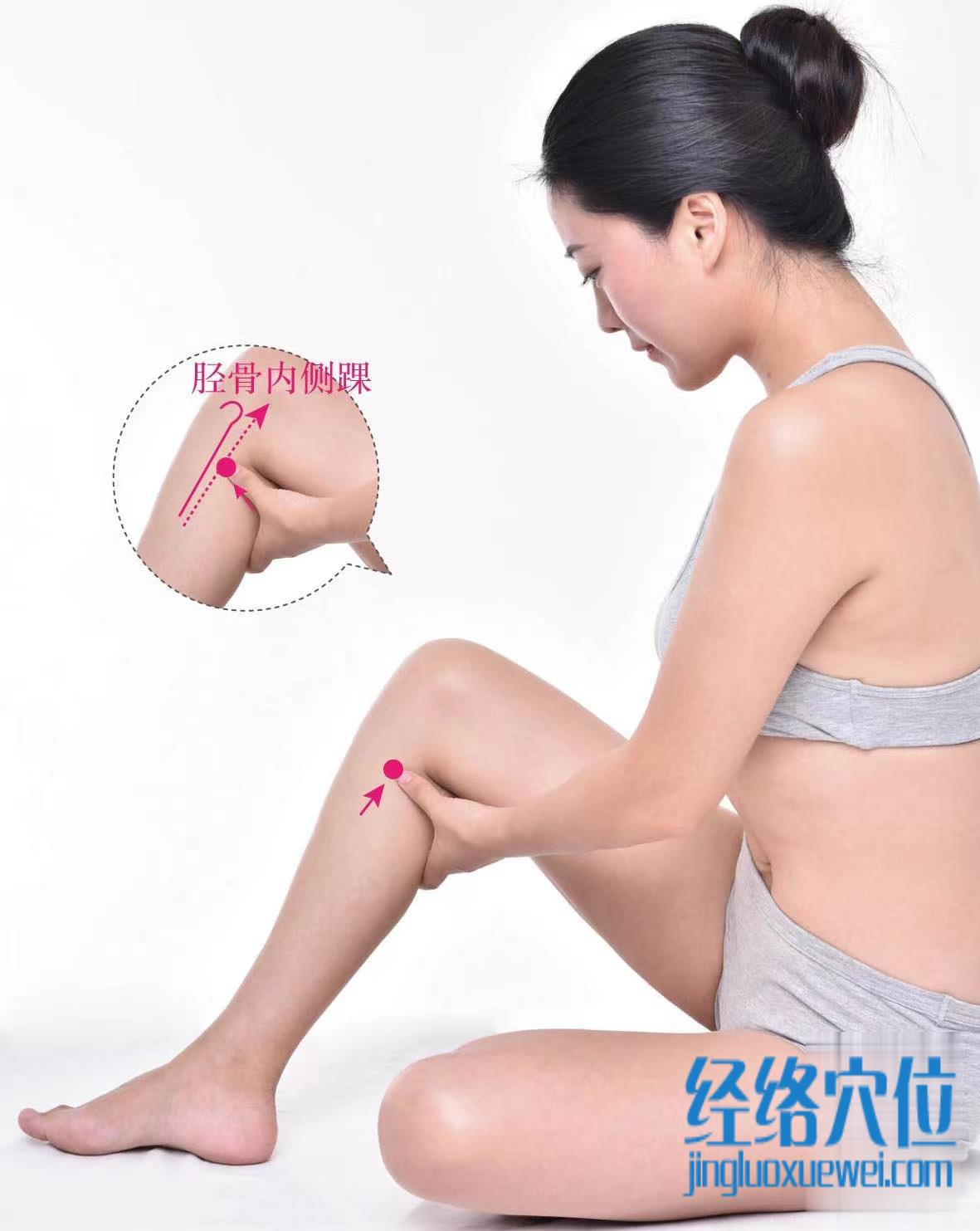 【取穴方法】用手指沿脛骨內(nèi)緣由下往上推,至手指抵膝關(guān)節(jié)下方時(shí),脛骨向內(nèi)上彎曲的凹陷中即是本穴。