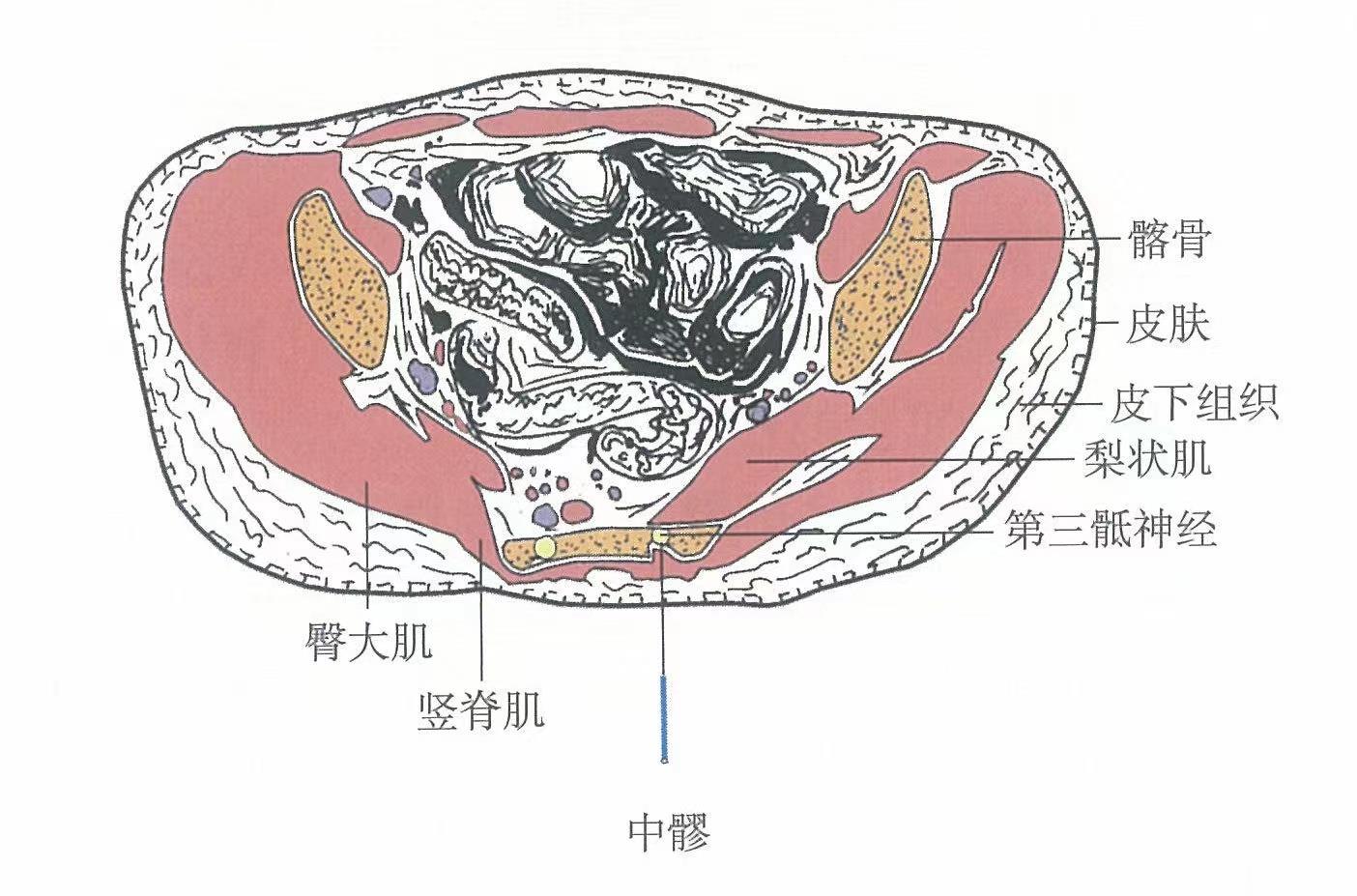 【解剖】皮膚→皮下組織→臀大肌→豎脊肌。淺層布有臀中皮神經。深層有第3骶神經和骶外側動、靜脈的后支。