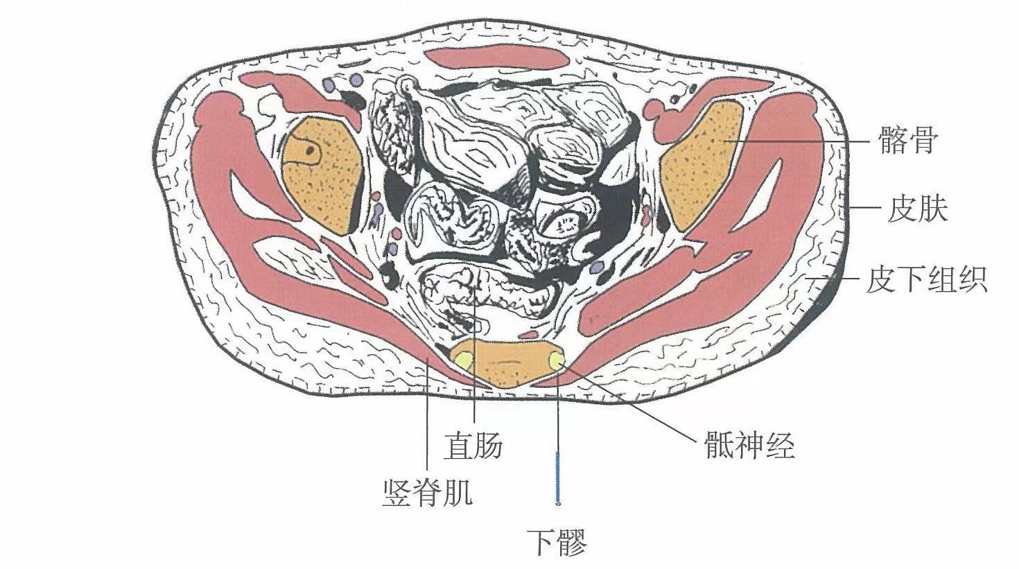 【解剖】在臀大肌起始部;有臀下動(dòng)、靜脈分支;當(dāng)?shù)?骶神經(jīng)后支通過(guò)處。