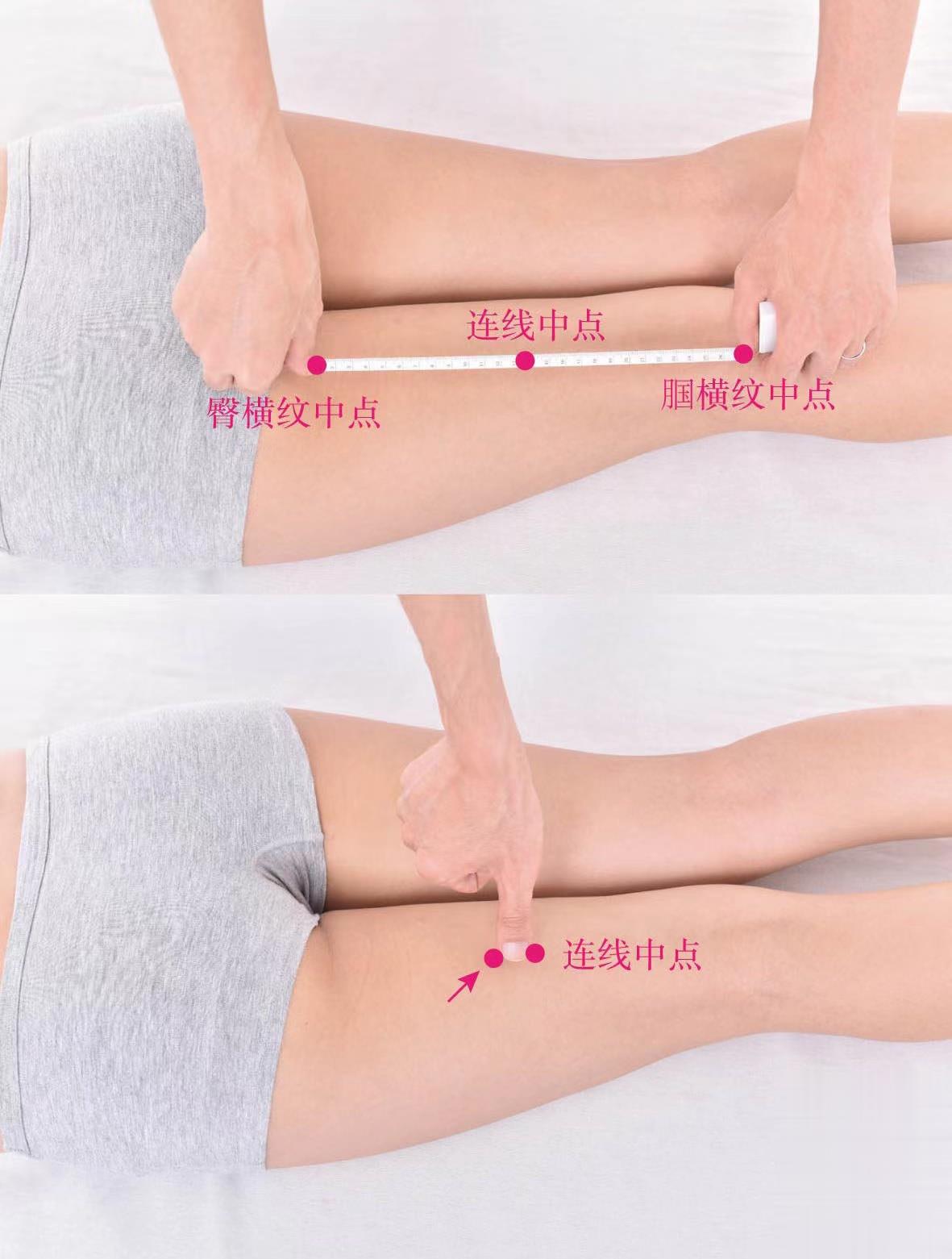 【取穴方法】正坐,雙手食指與中指并攏,其他手指彎曲,放于大腿后正中,臀部與膝蓋的中間位置偏上處,則中指所在位置即是。