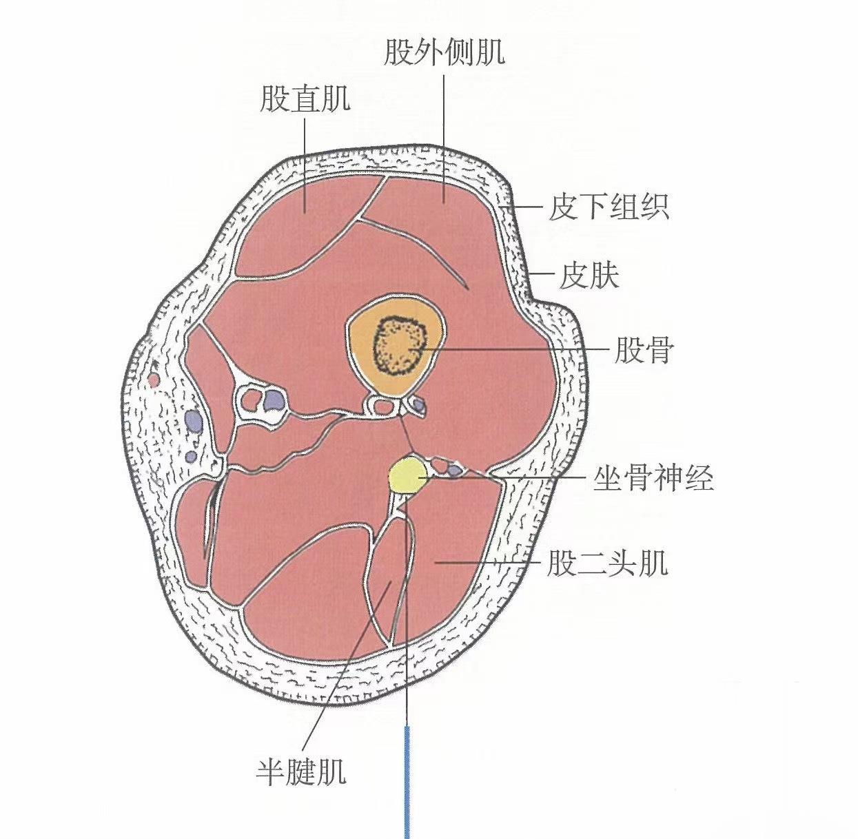 【解剖】在半腱肌與股二頭肌之間,深層為大收肌;外側(cè)為股深動(dòng)、靜脈第3穿支;布有股后皮神經(jīng),深層正當(dāng)坐骨神經(jīng)。