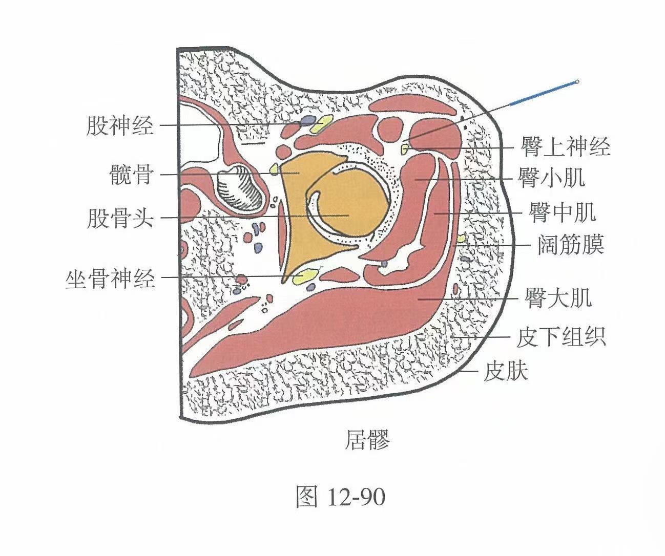 【解剖】皮膚→皮下組織→闊筋膜→臀中肌→臀小肌。淺層布有臀上皮神經(jīng)和髂腹下神經(jīng)外側(cè)皮支。深層有臀上動(dòng)、靜脈的分支或?qū)僦Ш屯紊仙窠?jīng)。