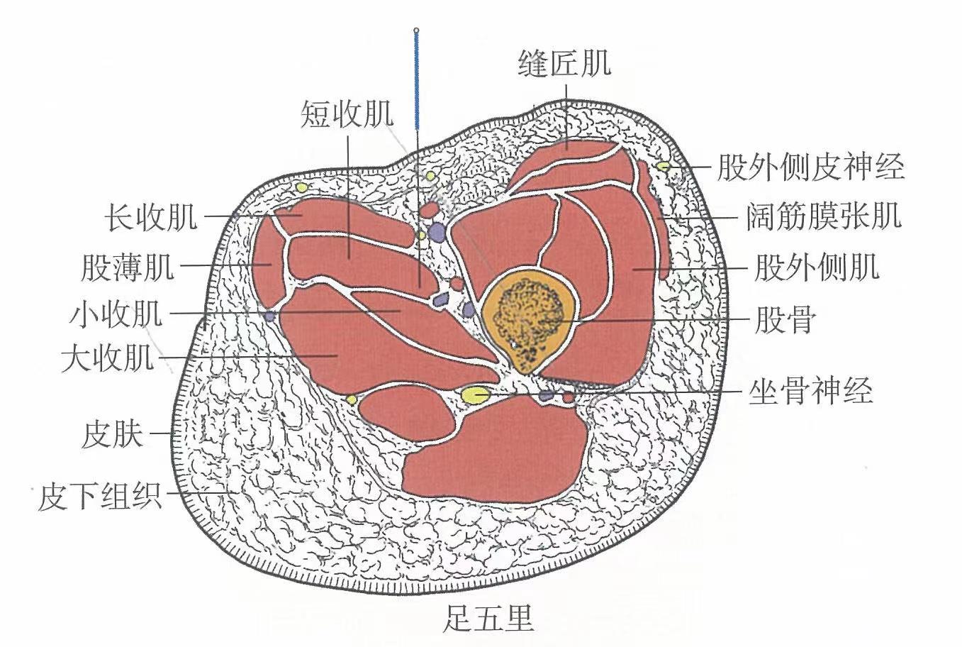 【解剖】皮膚→皮下組織→長收肌→短收肌→大收肌。淺層布有股神經的前皮支,大隱靜脈。深層有閉孔神經的前支和后支,股深動、靜脈的肌支,旋股內側動、靜脈的肌支。