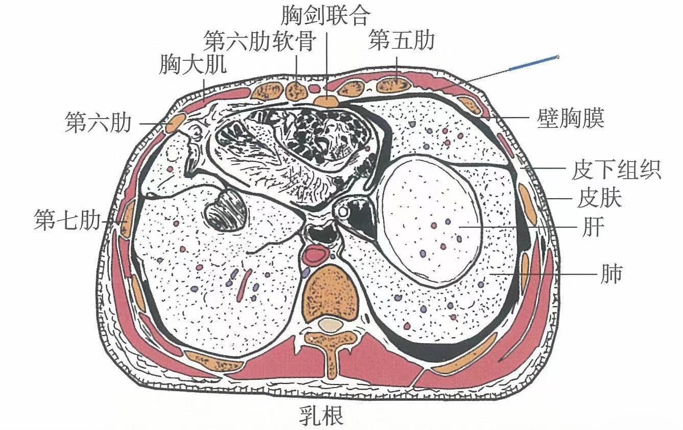 【解剖】淺部為乳腺組織(男性主要由結(jié)締組織構(gòu)成,乳腺組織不明顯),其下為胸大肌,深層有肋間內(nèi)、外肌;有肋間動(dòng)脈、胸壁淺靜脈;有第5肋間神經(jīng)外側(cè)皮支,深層為肋間神經(jīng)干。