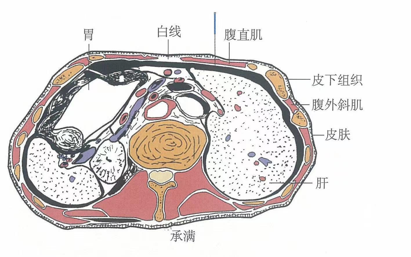 【解剖】當(dāng)腹直肌及其鞘處;有第7肋間動(dòng)、靜脈分支及腹壁上動(dòng)、靜脈分布;當(dāng)?shù)?、8肋間神經(jīng)分支處。