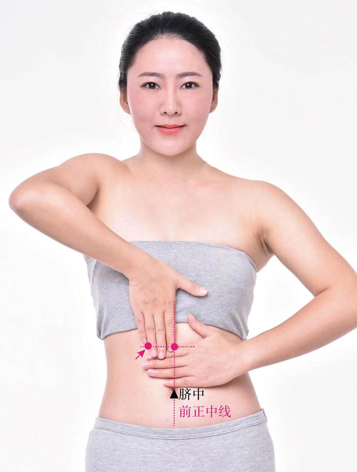 【取穴方法】以肚臍中心為起始點,用上述所做尺子,在前正中線上,量得3寸,以這個3寸對應的點,作一條水平線,此水平線垂直于前正中線。