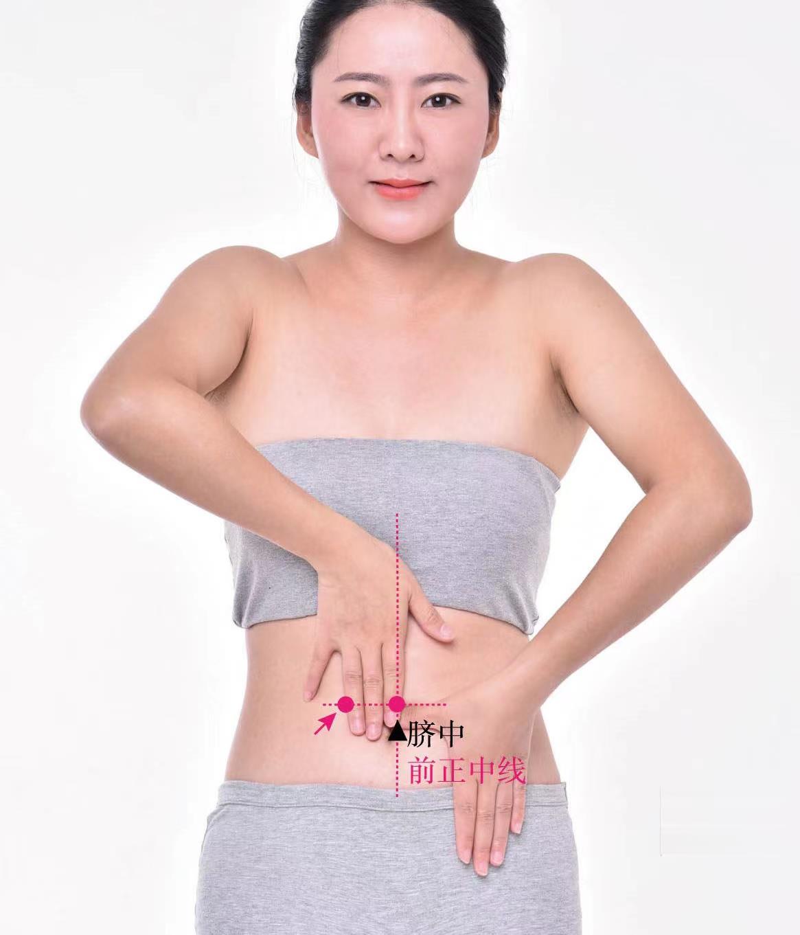 【取穴方法】從肚臍沿前正中線向外一橫指,再水平旁開三橫指,按壓有酸脹感處即為此穴。