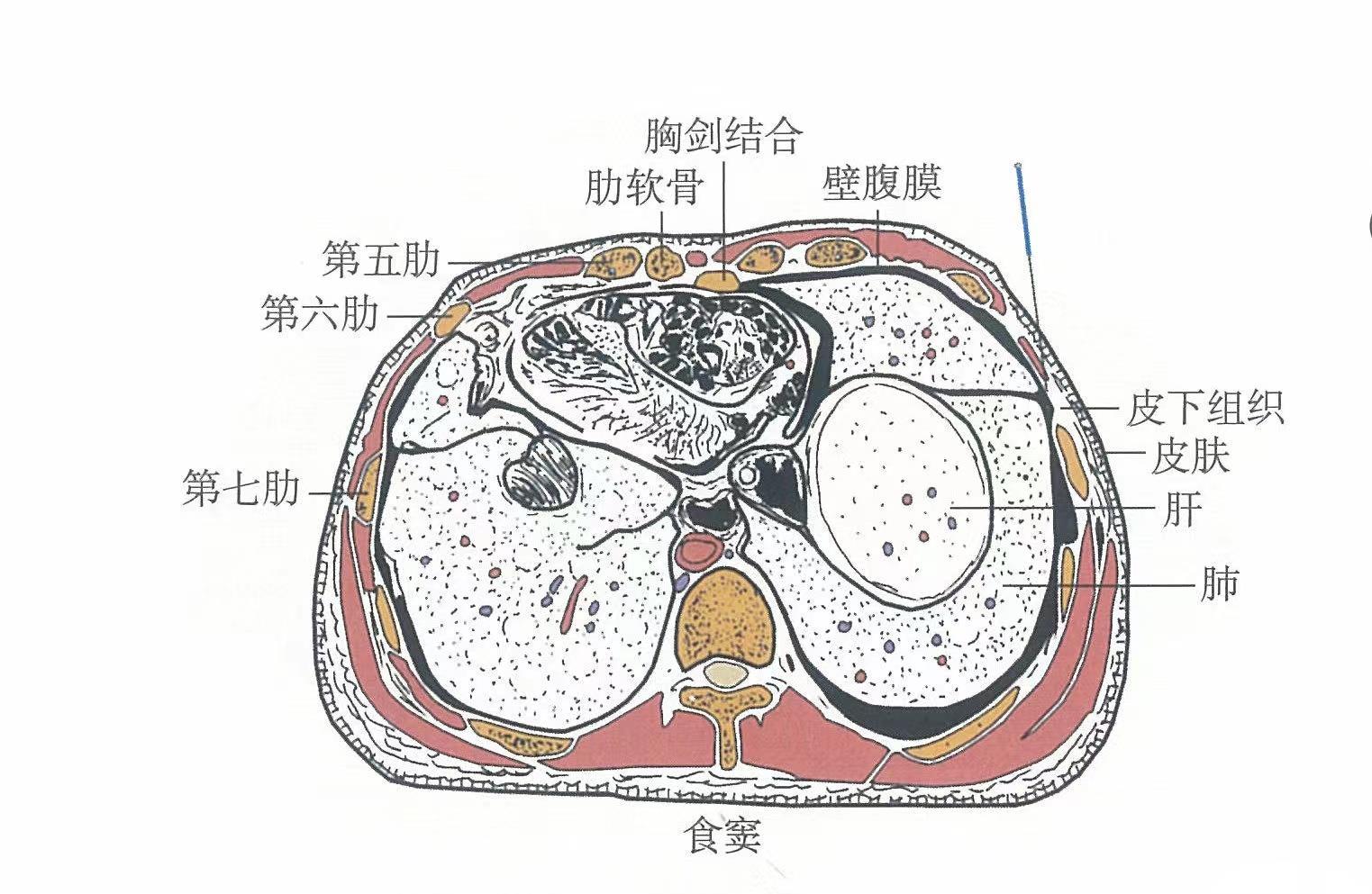 【解剖】皮膚→皮下組織→前鋸肌→肋間外肌。淺層布有第5肋間神經(jīng)外側(cè)皮支和胸腹壁靜脈。深層有胸長(zhǎng)神經(jīng)的分支,第5肋間神經(jīng)和第5肋間后動(dòng)、靜脈。