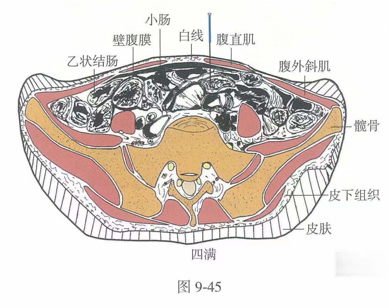 【解剖】皮膚→皮下組織→腹直肌鞘前壁→腹直肌。淺層布有腹壁淺動、靜脈的分支或屬支,第10、11、12胸神經前支的前皮支和伴行的動、靜脈。深層有腹壁下動、靜脈的分支或屬支,第10、11、12胸神經前支的肌支和相應的肋間動、靜脈。
