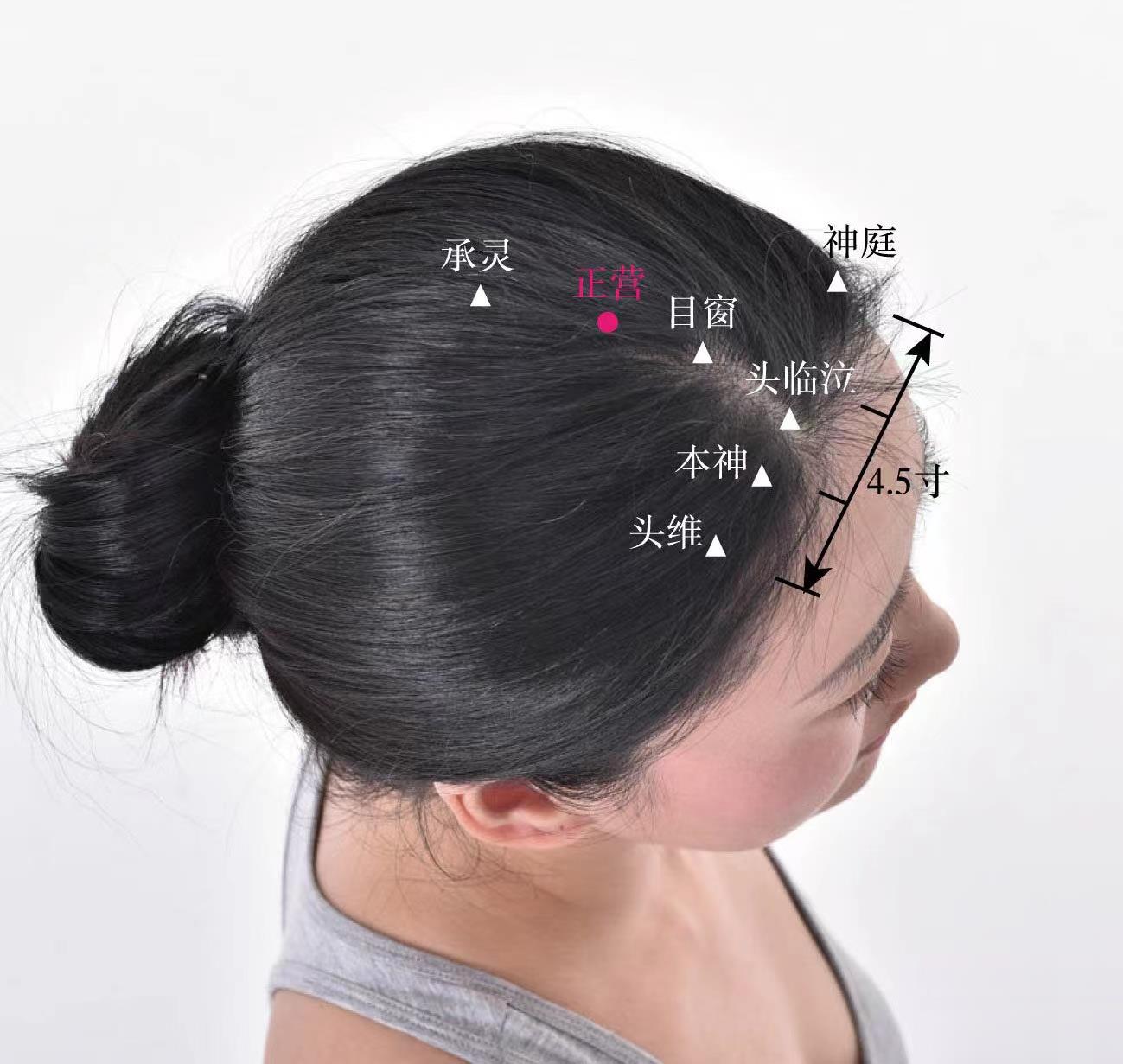 取前發(fā)際到百會(huì)(正坐,兩耳尖與頭正中線相交處,按壓有凹陷處即是百會(huì)穴)的中點(diǎn)作一水平線,再找到目窗 (正坐,眼向前平視,自眉中直上,前發(fā)際直上2橫指處即是目窗穴)作一垂直線,兩線交點(diǎn)處即是正營(yíng)穴