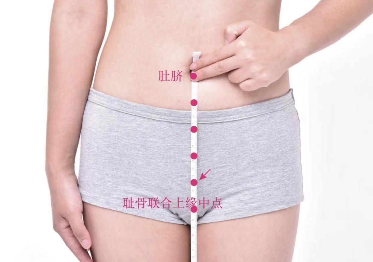 仰臥位。取一標有五等分的彈性皮筋,將其兩端與恥骨聯(lián)合上緣的中點、肚臍對齊拉緊,該皮筋上4/5與下1/5的交點處即為此穴。