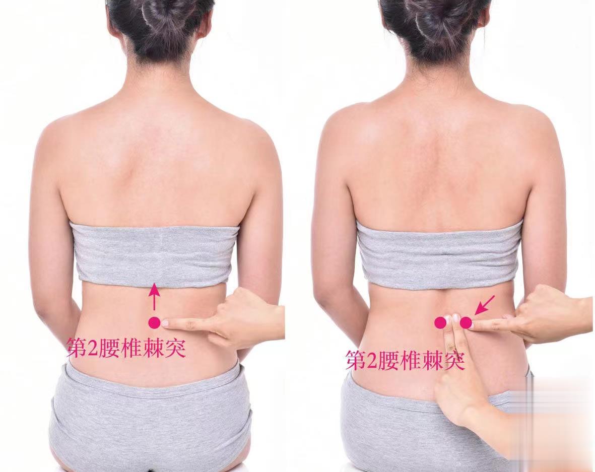 【取穴方法】腎俞穴位置在腰部,在和肚臍同一水平線的脊椎左右兩邊雙指寬處。