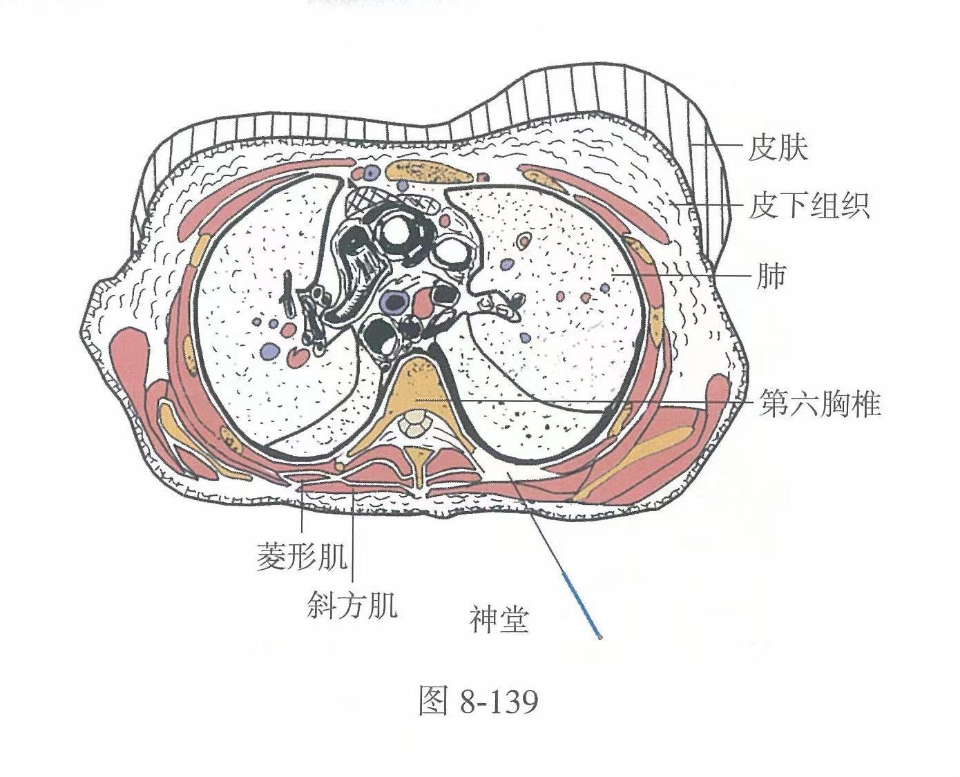 【解剖】皮膚→皮下組織→斜方肌→菱形肌→豎脊肌。淺層布有第5、6胸神經(jīng)后支的皮支和伴行的動、靜脈。深層有肩胛背神經(jīng),肩胛背動、靜脈,第5、6胸神經(jīng)后支的肌支和相應(yīng)的肋間后動、靜脈背側(cè)支的分支或?qū)僦А?br />