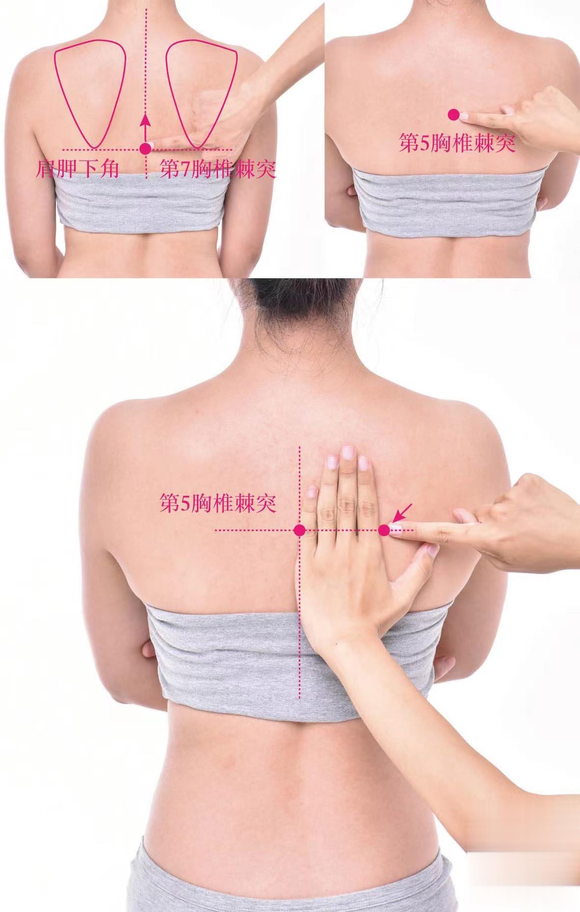 【取穴方法】正坐低頭或俯臥位。兩肩胛骨下角水平連線與脊柱相交所在的椎體即第7胸椎棘突,往上推2個椎骨(即第5胸椎),從該椎體棘突下緣旁開4橫指,按壓有酸脹感處即為此穴。