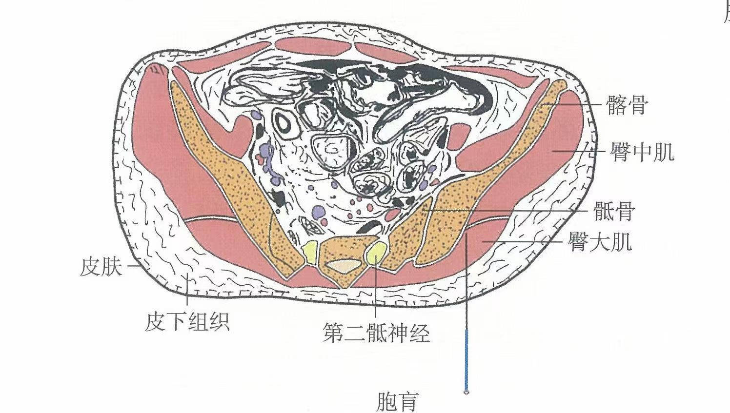 【解剖】皮膚→皮下組織→臀大肌→臀中肌。淺層布有臀上皮神經(jīng)和臀中皮神經(jīng)。深層有臀上動、靜脈,臀上神經(jīng)。