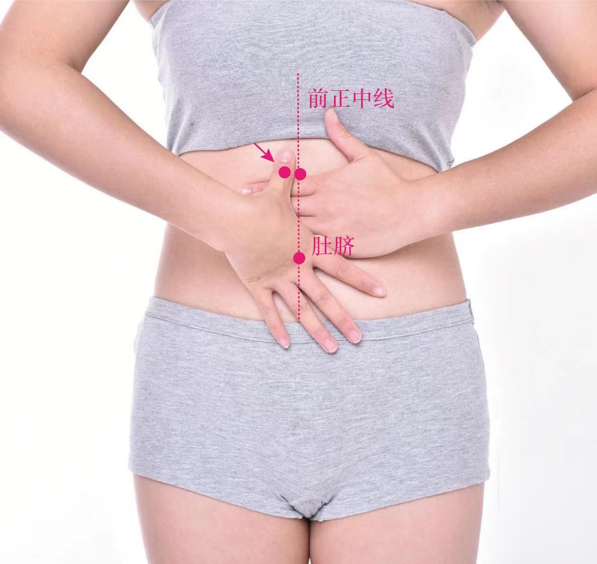 【取穴方法】仰臥位,在腹白線與肚臍水平線的交點處,旁開0.5寸處(半橫指),再向上量4橫指(即3寸處),按壓有酸脹感。