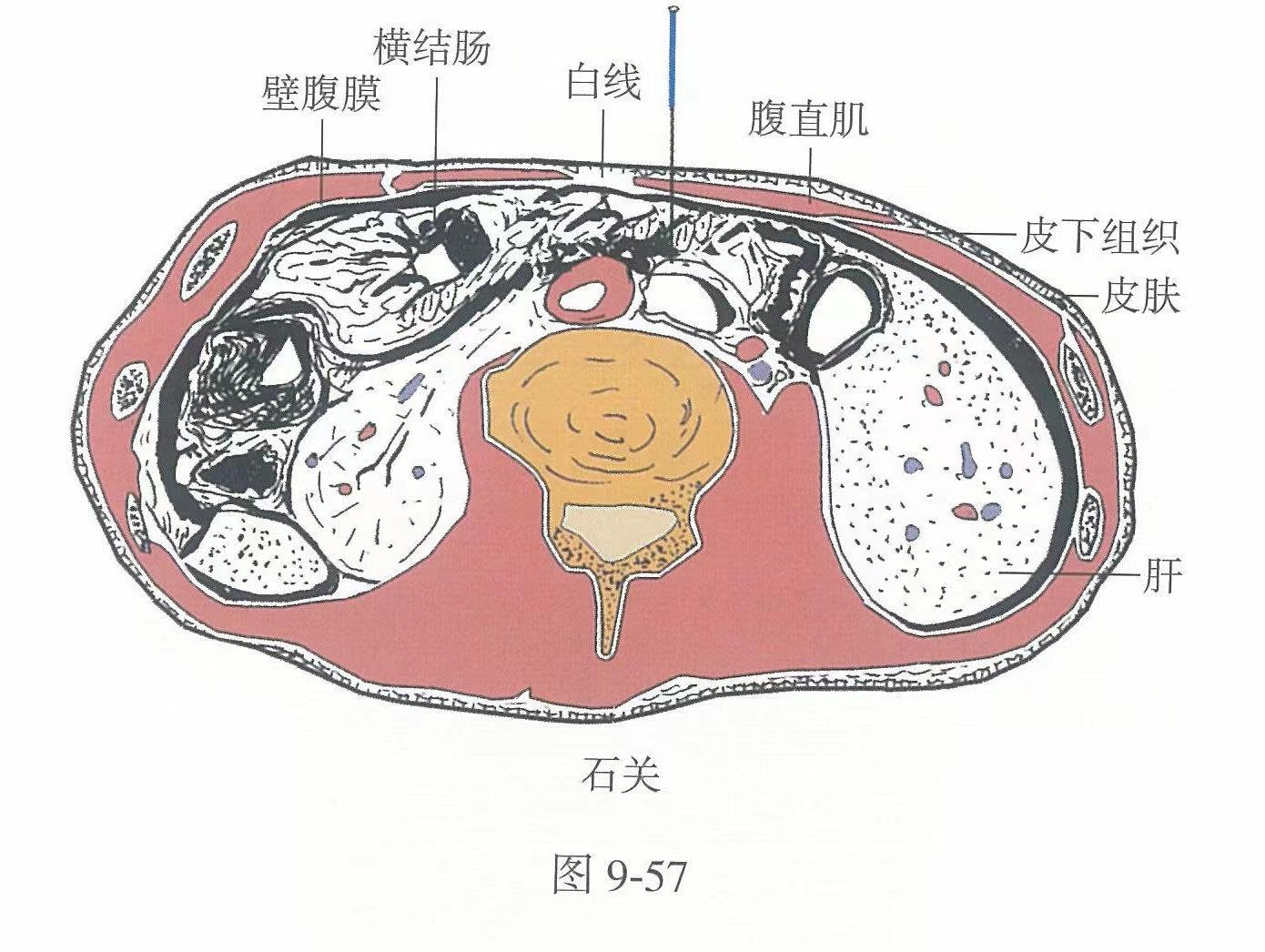 【解剖】皮膚→皮下組織→腹直肌鞘前壁→腹直肌。淺層布有腹壁淺靜脈,第7、8、9胸神經(jīng)前支及伴行的動、靜脈。深層有腹壁上動、靜脈的分支或?qū)僦?,?、8、9胸神經(jīng)前支的肌支和相應(yīng)的肋間動、靜脈。