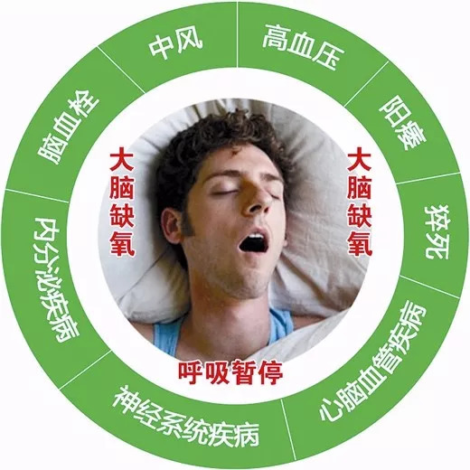 長期打鼾者或是打鼾嚴重的人往往都伴有“睡眠呼吸暫停綜合征”,睡眠呼吸暫停會造成大腦、血液嚴重缺氧,形成低血氧癥,而誘發(fā)高血壓、腦心病、心率失常、心肌梗死、心絞痛。
